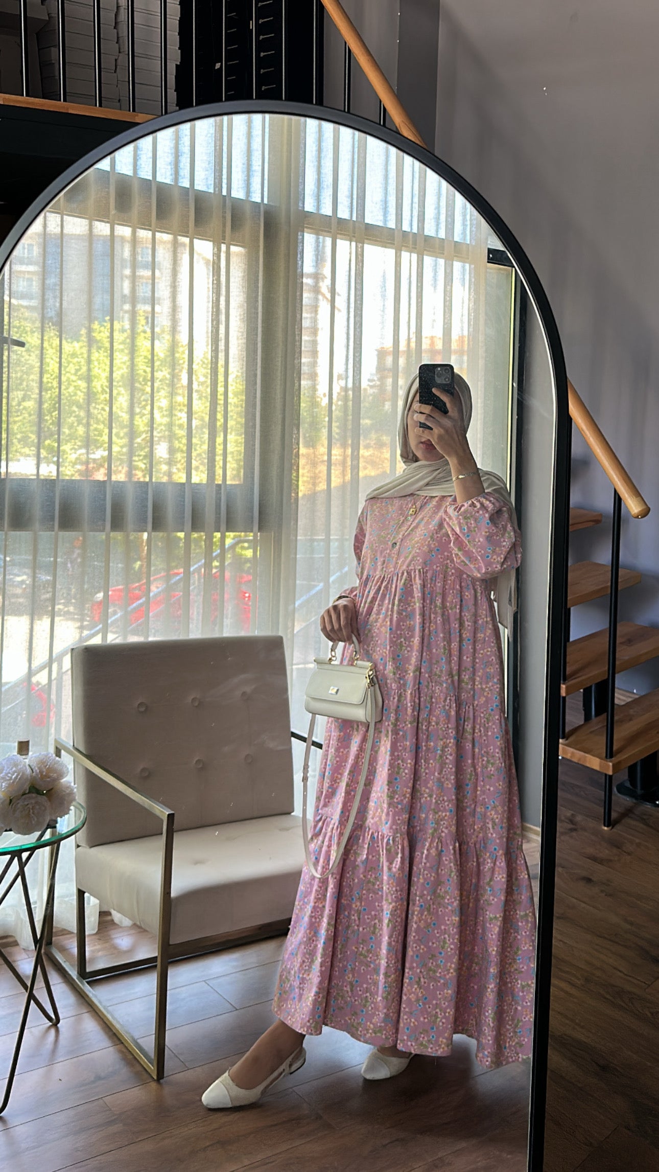 Çiçekli Pembe Keten Elbise - LIMITED EDITION